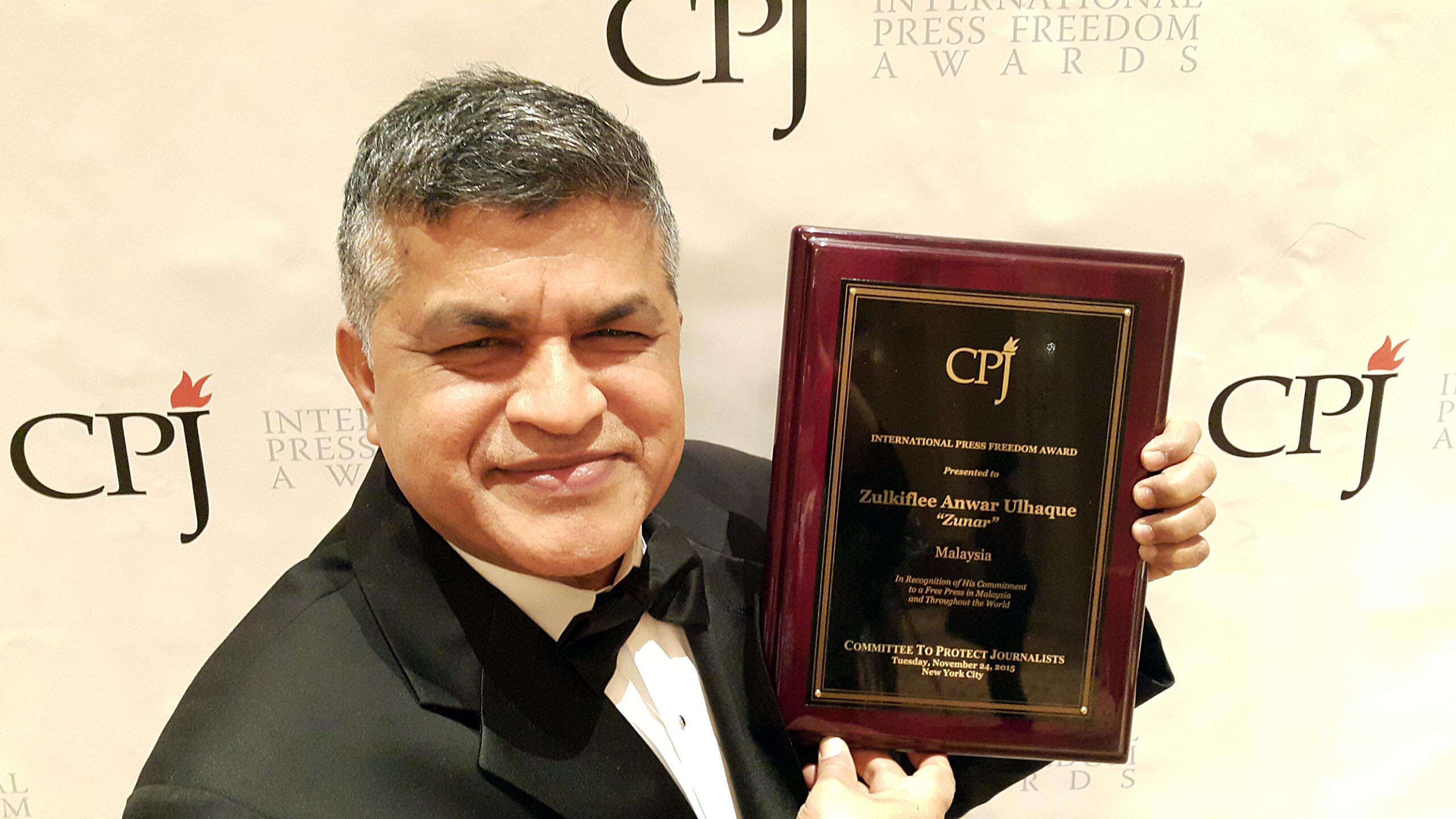 Saya berbangga menerima “Anugerah Kebebasan Akhbar Antarabangsa 2015” dari Committee to Protect Journalists (CPJ) di New York petang tadi (24 Nov 2015). Kartunis lagenda, Garry Trudeau menyampaikan award berprestij tersebut kepada saya di The Waldorf Astoria.