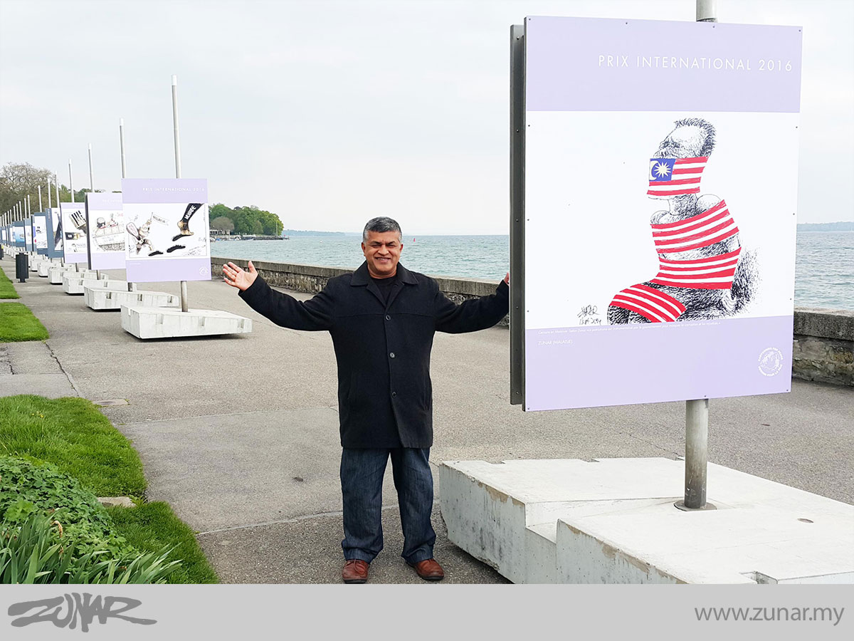 While an indoor exhibition may attract fans and collectors, an outdoor exhibition can provide more access for the public. In other words, while a gallery ‘invites’ people to see the exhibition, a public display ‘comes’ to you instead. This concept suits my objective as a cartoonist – to provide alternative information, stand, direction and of course jokes to the people through my works. Open and public friendly exhibition is more effective and gives more impact for the country, like Malaysia. This concept is inspired by my recent exhibition in Geneva which was held along the lake Lac Leman, organised by Cartooning For Peace Foundation.