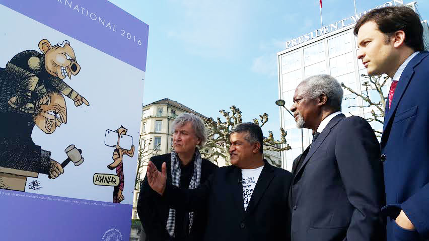Caption: 1. Zunar recieving the award from Kofi Annan at the Palais Eynard, Geneva. 2. Zunar explain to Kofi Annan about his cartoon at the exhibition at Lac Leman. Also present are Geneva Mayor, Mr Guillaume Barazzone (right) and cartoonist Plantu Zunar awarded “2016…